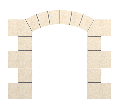 Arco de piedra natural caliza formado por dovelas de 60x40x40 cm, acabado abujardado, escuadradas y trabajadas en taller, con sección trapezoidal según plano de detalle, colocadas con mortero de cal industrial, color Natural, M-15, suministrado en sacos; montaje y desmontaje de cimbras y apeos.