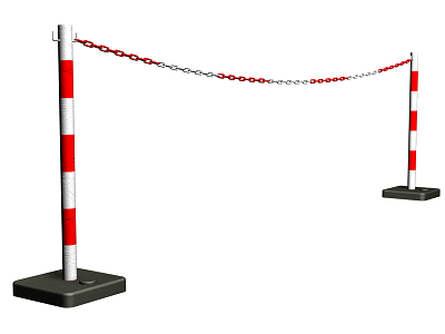 Cadena de delimitación de zona de peligro con eslabones de polietileno de alta densidad, de 53x21x6 mm de diámetro, color rojo y blanco, sujeta cada 3 m a postes de PVC, de 90 cm de altura y 50 mm de diámetro, color rojo y blanco, con base rellenable. Amortizable la cadena en 10 usos y los postes en 10 usos.