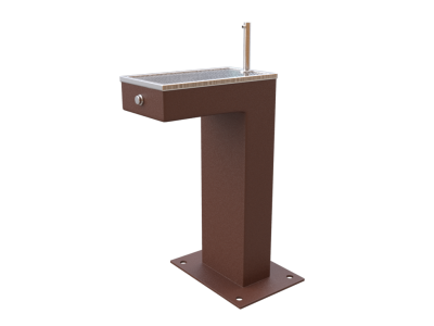 Fuente de 85 cm de altura, con cuerpo de chapa de acero cincado con protección antioxidante y pintura de color marrón, caño y pulsador de latón acabado cromado mate y rejilla y bandeja interior de acero inoxidable AISI 316L, colocación con marco de acero galvanizado y pernos de anclaje. | ||