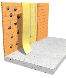 Aislamiento térmico por el interior de la hoja exterior, en fachada de doble hoja de fábrica para revestir, con panel flexible de lana de vidrio, según UNE-EN 13162, revestido por una de sus caras con un complejo de papel kraft con polietileno que actúa como barrera de vapor, de 50 mm de espesor, resistencia térmica 1,25 m²K/W, conductividad térmica 0,04 W/(mK). Colocación en obra: a tope, con pelladas de adhesivo cementoso. Incluso cinta autoadhesiva para sellado de juntas. | ||