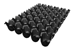 Drenaje en cubierta inclinada, ajardinada extensiva (ecológica), con una pendiente media del 5%, con lámina drenante y retenedora de agua, de poliestireno reciclado de alto impacto (HIPS), con nódulos de 40 mm de altura y perforaciones en la parte superior, resistencia a la compresión 280 kN/m², retención de agua superior a 23 l/m², colocada bajo la capa filtrante, solapando dos nódulos. | ||