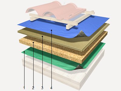 Aislamiento térmico por el exterior de cubiertas inclinadas de estructura continua de madera, formado por barrera de vapor de lámina autoadhesiva de polipropileno, de 0,45 mm de espesor y 130 g/m²; aislamiento térmico de panel aislante de capa única, de fibras de madera, de 40 mm de espesor y 1200x625 mm, de superficie lisa y mecanizado lateral recto, según UNE-EN 13171, resistencia térmica 1,05 m²K/W, conductividad térmica 0,04 W/(mK), densidad 110 kg/m³; aislamiento bajo teja de panel aislante impermeable, de fibras de madera, de 18 mm de espesor, de superficie lisa y mecanizado lateral machihembrado, resistencia térmica 0,4 m²K/W, conductividad térmica 0,046 W/(mK), densidad 260 kg/m³; e impermeabilización de lámina impermeabilizante de microfibras de polipropileno, de 0,5 mm de espesor y 145 g/m², Euroclase E de reacción al fuego según UNE-EN 13501-1, estanqueidad al agua clase W1 según UNE-EN 1928.
