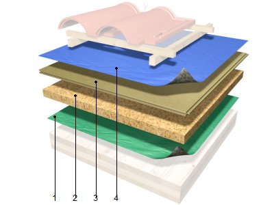 Aislamiento térmico por el exterior de cubiertas inclinadas de estructura continua de madera, formado por barrera de vapor de lámina autoadhesiva de polipropileno, de 0,45 mm de espesor y 130 g/m²; aislamiento térmico de panel aislante de capa única, de fibras de madera, de 60 mm de espesor y 1200x625 mm, de superficie lisa y mecanizado lateral recto, según UNE-EN 13171, resistencia térmica 1,6 m²K/W, conductividad térmica 0,04 W/(mK), densidad 110 kg/m³; aislamiento bajo teja de panel aislante impermeable, de fibras de madera, de 35 mm de espesor, de superficie lisa y mecanizado lateral machihembrado, resistencia térmica 0,86 m²K/W, conductividad térmica 0,046 W/(mK), densidad 260 kg/m³; e impermeabilización de lámina impermeabilizante de microfibras de polipropileno, de 0,5 mm de espesor y 145 g/m², Euroclase E de reacción al fuego según UNE-EN 13501-1, estanqueidad al agua clase W1 según UNE-EN 1928.