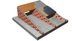 Cubierta inclinada con una pendiente media del 60%. FORMACIÓN DE PENDIENTES: tablero cerámico hueco machihembrado, para revestir, 100x30x3,5 cm, con las testas rectas, con una capa de regularización de mortero de cemento, industrial, M-5, de 3 cm de espesor y acabado fratasado y relleno de las juntas entre las piezas de dos tramos contiguos con el mismo mortero, sobre tabiques aligerados de ladrillo cerámico hueco de 24x11,5x9 cm recibido con mortero de cemento, industrial, M-5, rematados superiormente con maestras de mortero de cemento, industrial, M-5, todo ello sobre forjado de hormigón; IMPERMEABILIZACIÓN: tipo monocapa adherida, formada por lámina de betún modificado con elastómero SBS, LBM(SBS)-30-FP, con armadura de fieltro de poliéster no tejido de 160 g/m², de superficie no protegida, totalmente adherida al soporte con soplete previa imprimación con emulsión asfáltica aniónica con cargas tipo EB; COBERTURA: pizarra para techar en piezas rectangulares, 32x22 cm, de segunda calidad, grueso 3 a 4 mm, colocadas formando tres espesores (cubierta terciada), y fijadas sobre rastreles de madera de pino de 42x27 mm. Incluso, resolución de puntos singulares y piezas especiales de la cobertura. | ||