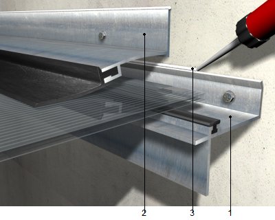 Encuentro frontal de faldón con paramento vertical para cubierta inclinada con una pendiente mayor del 10%, con perfil de apoyo de aluminio, de 1,8 mm de espesor, 65 mm de anchura, 120 mm de altura y 4000 mm de longitud, con junta de neopreno y perfil de cierre superior de aluminio, de 1,8 mm de espesor, 60 mm de anchura, 40 mm de altura y 4000 mm de longitud, con junta de neopreno. Incluso accesorios de fijación de los perfiles al paramento vertical y silicona neutra oxímica, para sellado de juntas. | ||