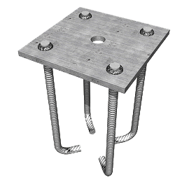 Placa de anclaje de acero UNE-EN 10025 S275JR en perfil plano, con taladro central biselado, de 250x250 mm y espesor 12 mm, con 4 pernos soldados, de acero corrugado UNE-EN 10080 B 500 S de 12 mm de diámetro y 50 cm de longitud total. | ||
