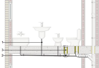 Red interior de evacuación, para cuarto de baño con dotación para: inodoro, lavabo sencillo, bañera, bidé, realizada con tubo de PVC, serie B para la red de desagües. | ||