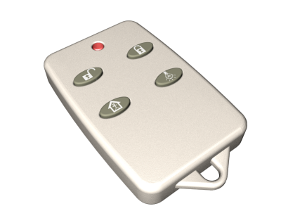 Mando a distancia con comunicación vía radio, con cuatro botones, led indicador de batería baja y batería de litio de 3 V.