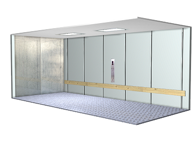 Montacoches eléctrico de adherencia para 3000 kg y 0,6 m/s, sistema de accionamiento de 1 velocidad de 2 paradas (3 m), maniobra universal simple, puertas de acceso correderas automáticas de 220 cm de ancho y 200 cm de altura en acero pintado, cabina sin puerta y nivel medio de acabado. | ||