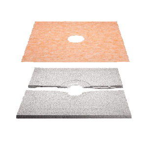 Formación de pendientes en ducha de obra, con kit Schlüter-KERDI-SHOWER-T 915/1220 BF "SCHLÜTER-SYSTEMS", de 1220x915 mm, formado por panel de formación de pendientes de dos piezas con una pendiente mayor del 2% y lámina impermeabilizante flexible de polietileno con geotextil no tejido. Incluso adhesivo cementoso de fraguado normal C1, para fijar el panel al soporte y adhesivo bicomponente, Schlüter-KERDI-COLL-L "SCHLÜTER-SYSTEMS" para fijar la lámina al panel. | ||