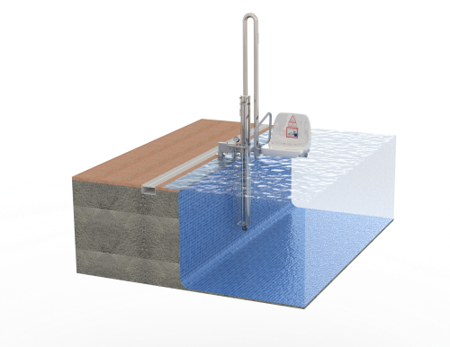 Ascensor acuático hidráulico, móvil, PK "METALU", de acero inoxidable AISI 316, con 150 kg de capacidad de carga y un desplazamiento vertical del asiento de 1,06 m, formado por soporte metálico, unido a un cilindro con una estructura soporte tubular en U en su extremo, unida a su vez a un asiento desmontable de PVC, con capacidad de desplazamiento vertical y giro; introducción del soporte en casquillo metálico fijado con resina epoxi-acrilato, en taladro previamente ejecutado en el borde de la piscina. | ||