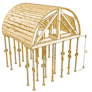Cimbra de madera, amortizable en 1 uso, para el apeo de bóveda de cañón de 1/2 pie de espesor, apoyada sobre sopandas de madera y puntales metálicos telescópicos de 3 m de altura, amortizables en 150 usos, dimensionada para soportar una carga máxima de trabajo de 400 kg/m². | ||