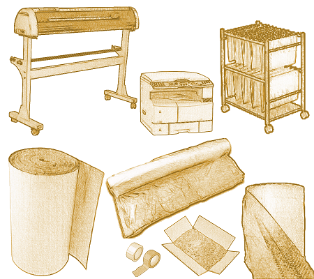 Embalaje de equipamiento auxiliar como archivos, material electrónico, etc., (aproximadamente 7 ud/m³), mediante láminas de polietileno transparente, film alveolar y cajas de cartón, para su transporte hasta el lugar de almacenaje. | ||