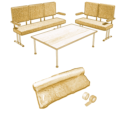 Suministro y colocación de láminas de polietileno transparente sobre el mobiliario (aproximadamente 2 ud/m³), solapadas entre sí al menos 15 cm y fijadas con cinta adhesiva, para protegerlo frente a la suciedad y el polvo ocasionado por los trabajos de rehabilitación. Incluso posterior retirada de láminas, recogida y carga sobre contenedor.