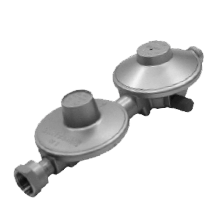 Regulador de presión con válvula de seguridad por exceso de presión de 300 mbar de presión máxima y rearme manual, de 5 m³/h de caudal máximo, de 0,5 a 4 bar de presión de entrada y 150 mbar de presión de salida.