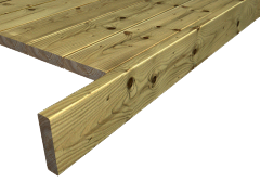 Perfil de madera maciza, de pino Suecia, de hasta 100 mm de altura y 24 mm de espesor, cepillado, para aplicación de un tratamiento protector y decorativo en obra, con accesorios de montaje, para remate lateral de tarima de madera para exterior. | ||