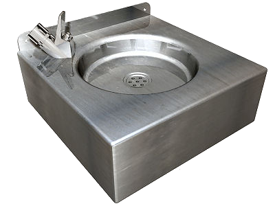 Fuente de agua, mural, de 115x300x300 mm, con carcasa de acero inoxidable AISI 304, grifo surtidor con regulación de la altura de chorro, válvula de desagüe y peto trasero para fijación mural, con llave de corte.