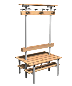 Banco doble para vestuario con respaldo, perchero, altillo y zapatero, de 1000 mm de longitud, 780 mm de profundidad y 1810 mm de altura, formado por dos asientos de tres tablas, dos respaldos de una tabla, dos percheros de una tabla con tres perchas metálicas, dos altillos de una tabla y dos zapateros de dos tablas cada uno, de madera barnizada de pino de Flandes, de 90x20 mm de sección, fijados a una estructura tubular de acero, de 35x35 mm de sección, pintada con resina de epoxi/poliéster color blanco. | ||