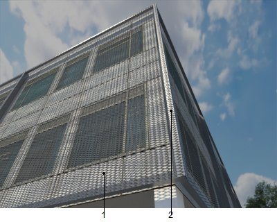 | Revestimiento exterior de fachada, de tejido metálico formado por paneles de chapa de metal expandido (déployé) | ||