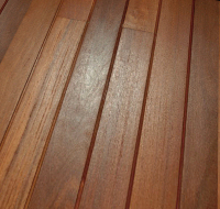 Tarima para exterior, formada por tablas de madera maciza, de lapacho, de 35x155x800/2800 mm, resistencia al deslizamiento clase 3, según CTE DB SU, fijadas mediante el sistema de fijación vista, sobre rastreles de madera de pino, de 65x38 mm, con clase de uso 4 según UNE-EN 335, separados 60 cm entre sí y fijados a la solera de hormigón con tacos expansivos metálicos y tirafondos; cepillado y posterior aplicación de dos manos de lasur al agua de secado rápido para interior y exterior, para suelos, color Pino, acabado satinado rendimiento: 0,083 l/m² cada mano como tratamiento protector y decorativo. Incluso tirafondos para sujeción de las tablas a los rastreles y piezas especiales.